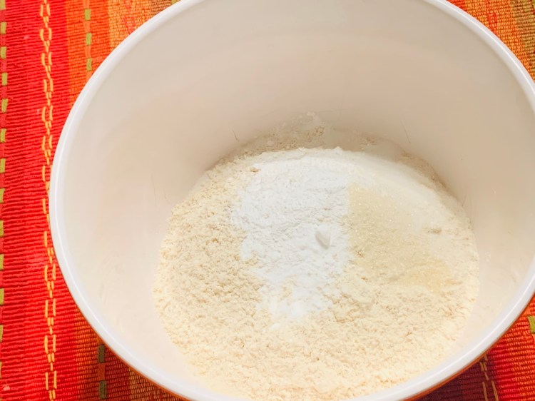 - In a mixing bowl, add whole wheat flour, baking powder, baking soda, salt and sugar.