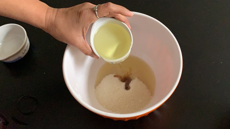 - In a mixing bowl, add Sugar, Oil, lime juice, vanilla extract and ¼ Cup Water