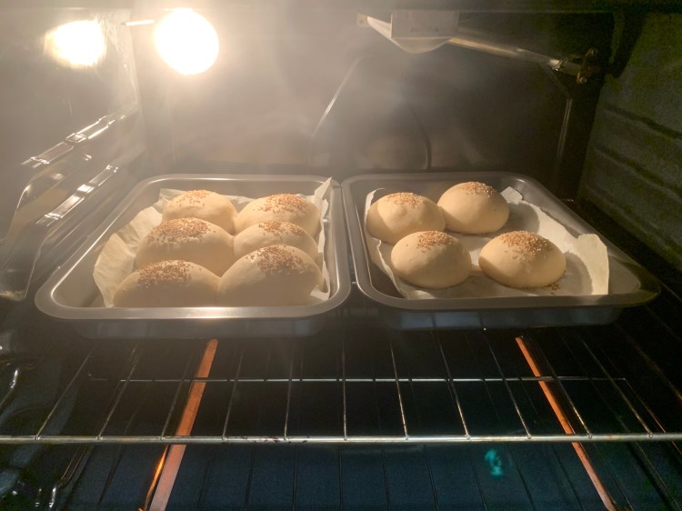 - Apply a thin layer of water with a brush on top of each bun (you can use plant-based milk)