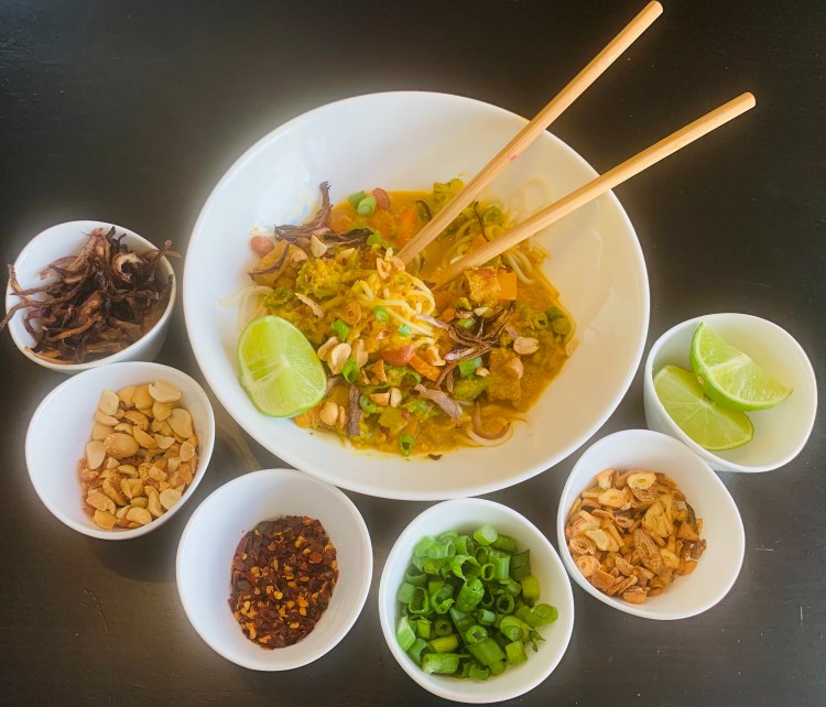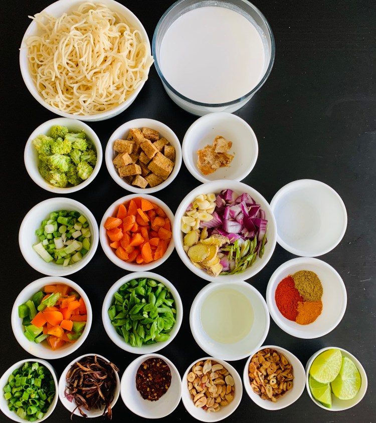 Khow Suey is a delicious Burmese dish. It is a wholesome meal. Noodles are served with a flavorful coconut milk-based curry and vegetables. The flavors are enhanced by adding the condiments such as fried onions, chili flakes, fried garlic, and spring onion. This vegan version of Khow suey will become your favorite one-dish meal.