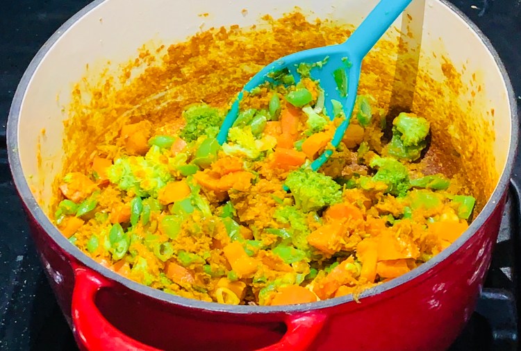 - I have used a Dutch oven to cook the curry and hence it needs to be stirred continuously