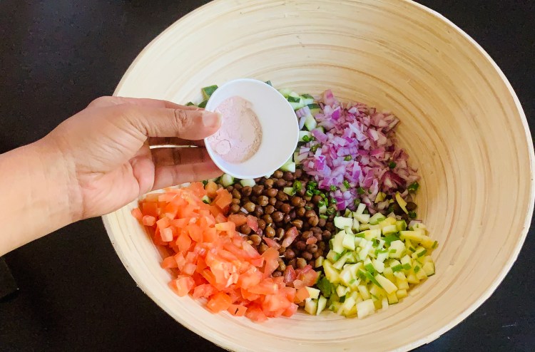 - If you are using canned black chana, strain the water , rinse and add to salad bowl